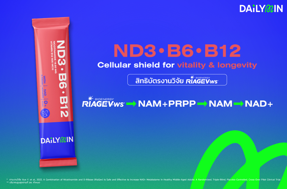 แม้การพูดเรื่อง NAD+ จะเริ่มจากสารตั้งต้นอย่าง Nicotinamide แต่ถ้าจะให้ภาพรวมของการดูแลร่างกายสมบูรณ์ขึ้น ก็ต้องมองไปถึงวิตามินตัวอื่นที่ช่วยสนับสนุนการทำงานของเซลล์ สมอง และระบบประสาทด้วย นี่จึงเป็นที่มาของแนวคิด ND3•B6•B12