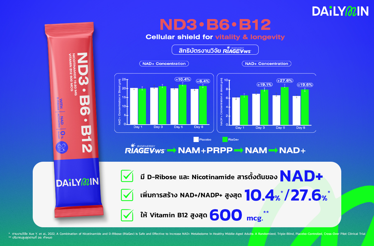 สำหรับคนที่อยากดูแลตัวเองแบบเรียบง่ายแต่สม่ำเสมอ DAiLYMIN ND3•B6•B12 หรือ NAD+ SHOT ตามงานวิจัยของ RiaGev-WS® ที่เพิ่มการสร้าง NAD+ และ NADP+ สุงสุดถึง 10.4% และ 27.6% จึงเป็นแนวคิดของการเติมสิ่งสำคัญให้ร่างกายในรูปแบบ SHOT ที่พกง่าย กินง่าย และเข้ากับชีวิตจริงได้ทุกวัน